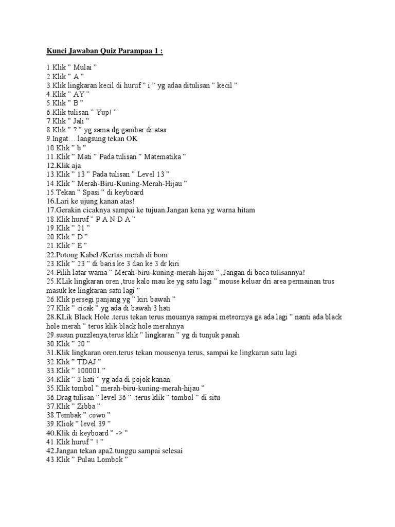 Level 3 titik dihuruf i! Kunci jawaban quiz parampaa 1 dan 2 password lengkap. Kunci jawaban quis parampa 1,2,kita semua. Versi quiz parampaa ini sudah menjadi 2 versi, dan setiap versi mempunyai tingkat kesulitan yang berbeda. Temukan kata berwarna hijau di antara kata berwarna merah. Kunci jawaban kuis paraampa 1 & 2. Kunci jawaban parampaa 1 dan 2 password jawaban parampaa 1 dan 2 jawaban kuis parampaa 1 dan 2 serta password level parampaa adalah kuis yang menguji otak kita untuk berpikir lebih keras karena jawabannya terkadang aneh dan tak terduga disini memberikan secara gratis jawaban lengkap quiz parampaa 1 dan 2. Jawaban lengkap quiz parampaa 1 dan 2 1. Level 1 klik tulisan mulai. Tahan klik kiri trus ke level 103. Buat sobat yang belum tahu dan ingin mencobanya sobat dapat bermain secara online di. Semua sudah dikutip dari berbagai sumber. Www.slideshare.net 25 responses to kunci jawaban quiz parampa 1 update rahma abdul kholik 16 november 2013 at 20 22 mau tanya kalau yang level 40 gimna nggak bisa bisanya.