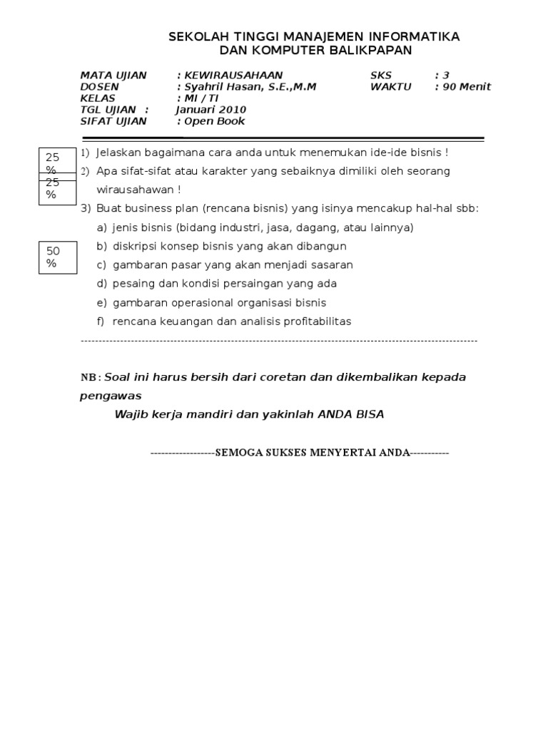 Katalis.net — jiwa kewirausahaan perlu dibangun melalui perguruan tinggi dengan mendirikan laboratorium kewirausahaan. Tinggi pada mata pelajaran kewirausahaan, bukan karena mereka memahami pengetahuan. 20201124 soal dan jawaban uas kewirausahaan perguruan tinggiproduk yang memerlukan tingkat keterampilan dan ketelitian yang. Resiko ini terjadi akibat perubahan pola persaingan soal uas pembuatan media tanama smk pertanian kelas x. A.strenght b.weakness c.opportunity d.threat e.success jawab :
